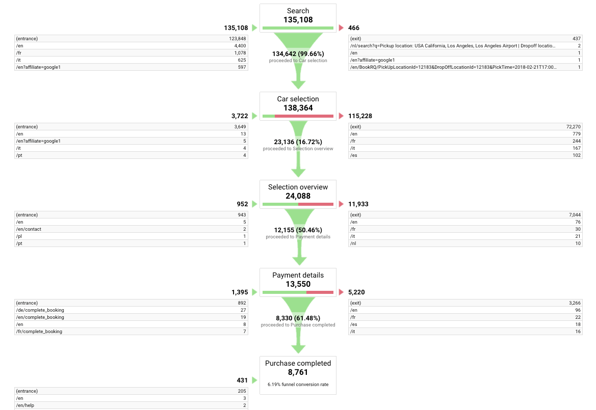 Below is an example of a report with device categories, which shows you at least one interesting thing: If you compare Goal 5 (Purchase) conversion rate amongst devices, it is higher on desktop than on mobile devices. But on the other hand, the 2nd step’s (Cars list) conversion rate is higher on mobile than desktop devices. In addition, you can see the biggest drop-off on Mobile occurs at the last step.